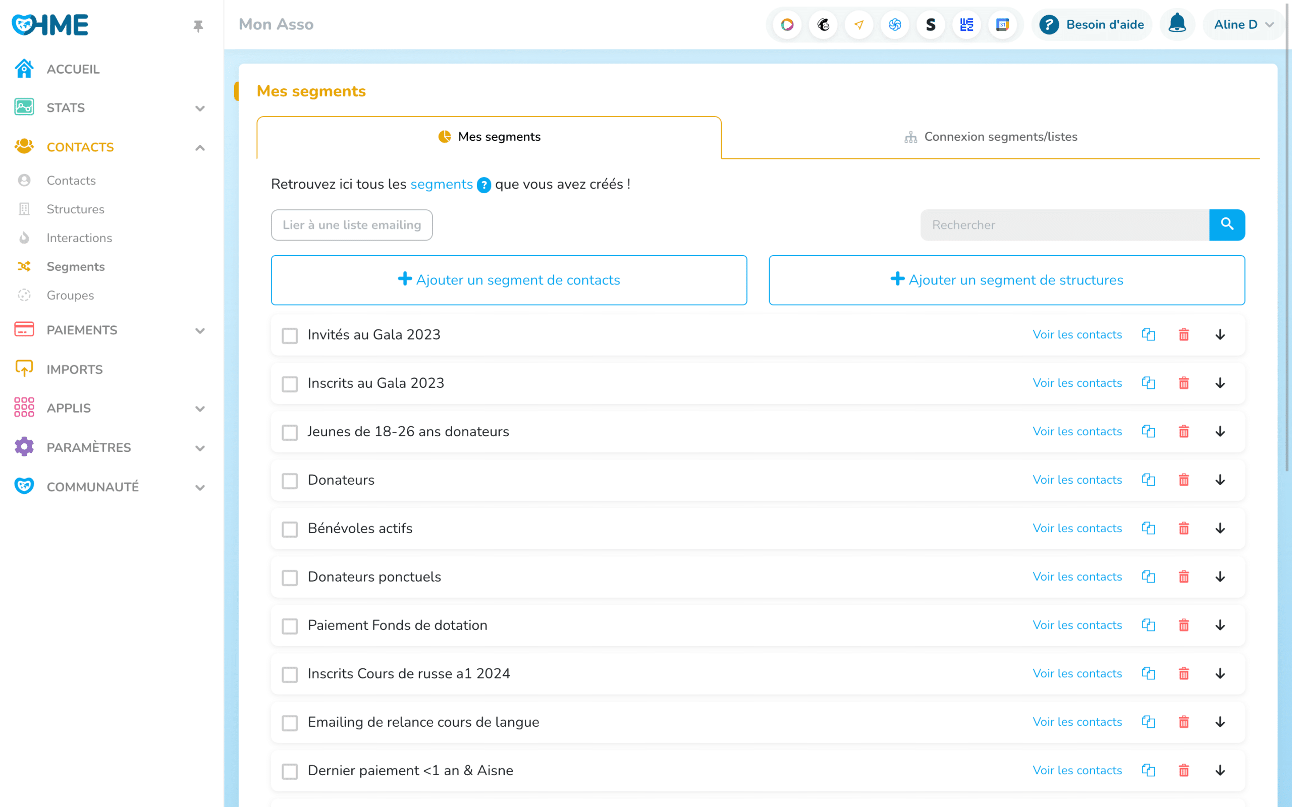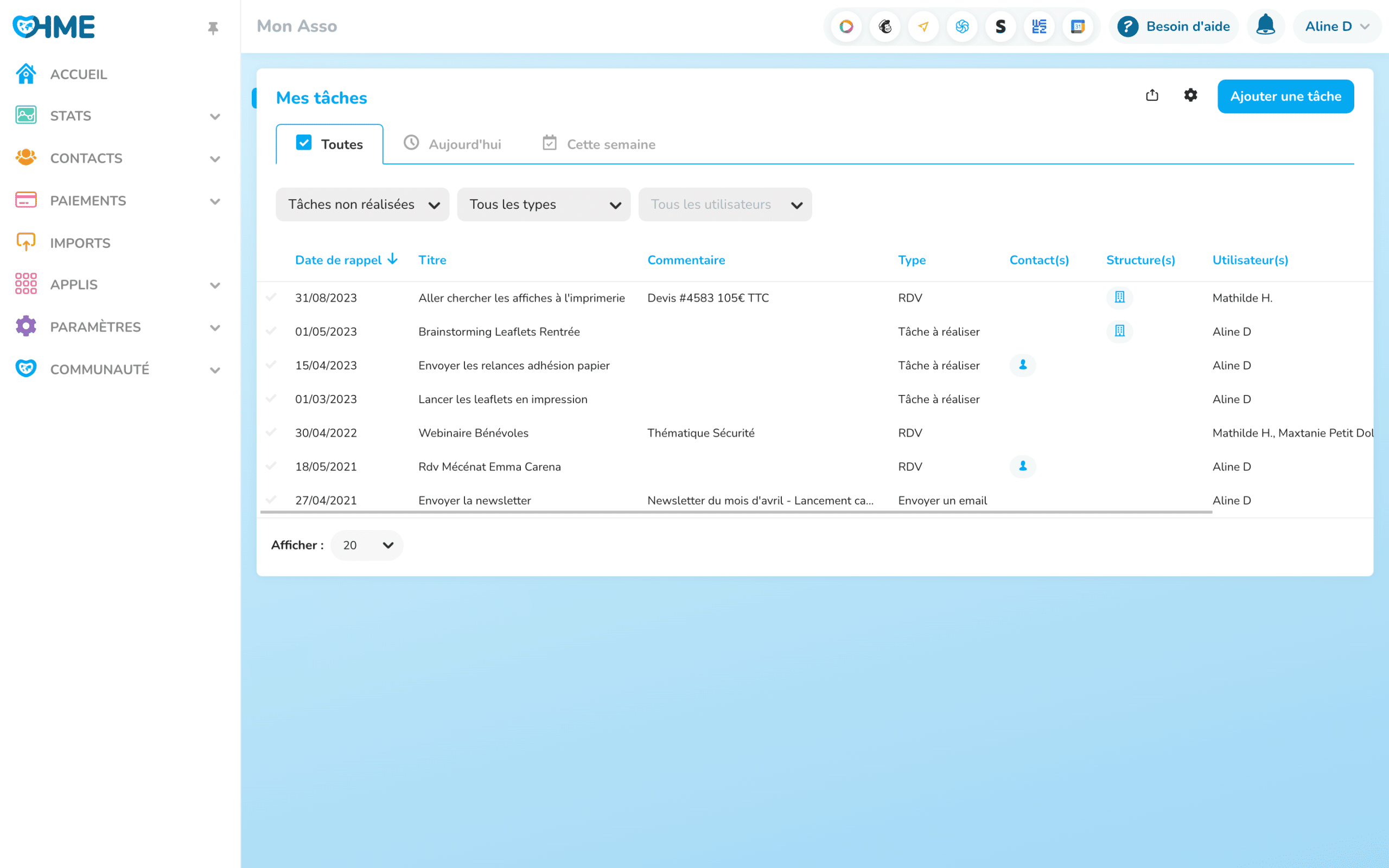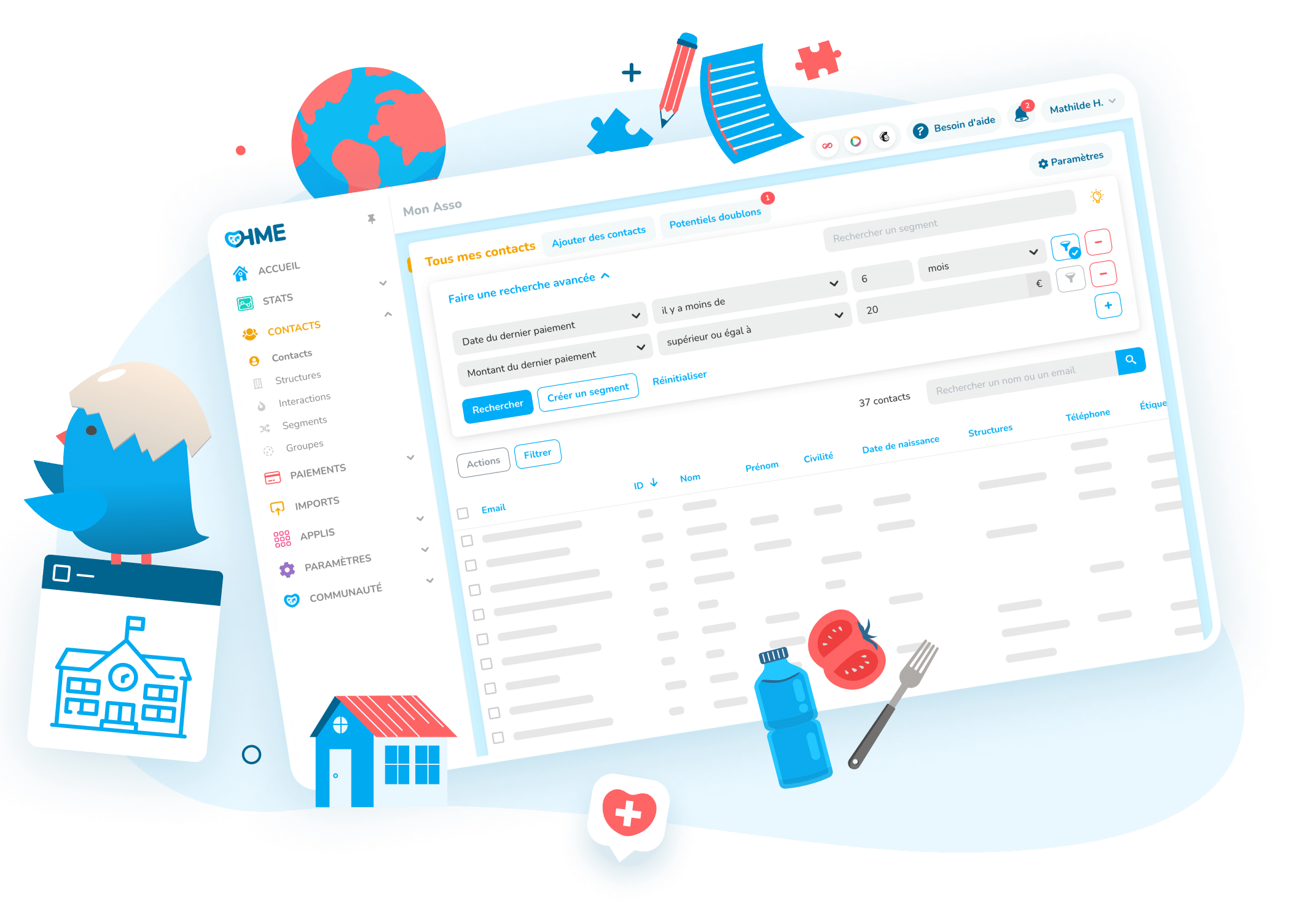 OHME est un CRM pour association. Autrement dit, notre plateforme en ligne, dite en Saas, permet de centraliser et d'organiser tous les contacts de votre association sur une plateforme collaborative et connectée à vos outils. En effet, sa particularité est de se connecter, par API, à des soutions partenaires (d’emailing, de collecte, de billetterie et de comptabilité) et ainsi, de centraliser toutes les données sur OHME de manière automatique. Notre objectif ? Vous permettre de suivre vos statistiques et de gérer tous vos contacts sur une seule et même plateforme.