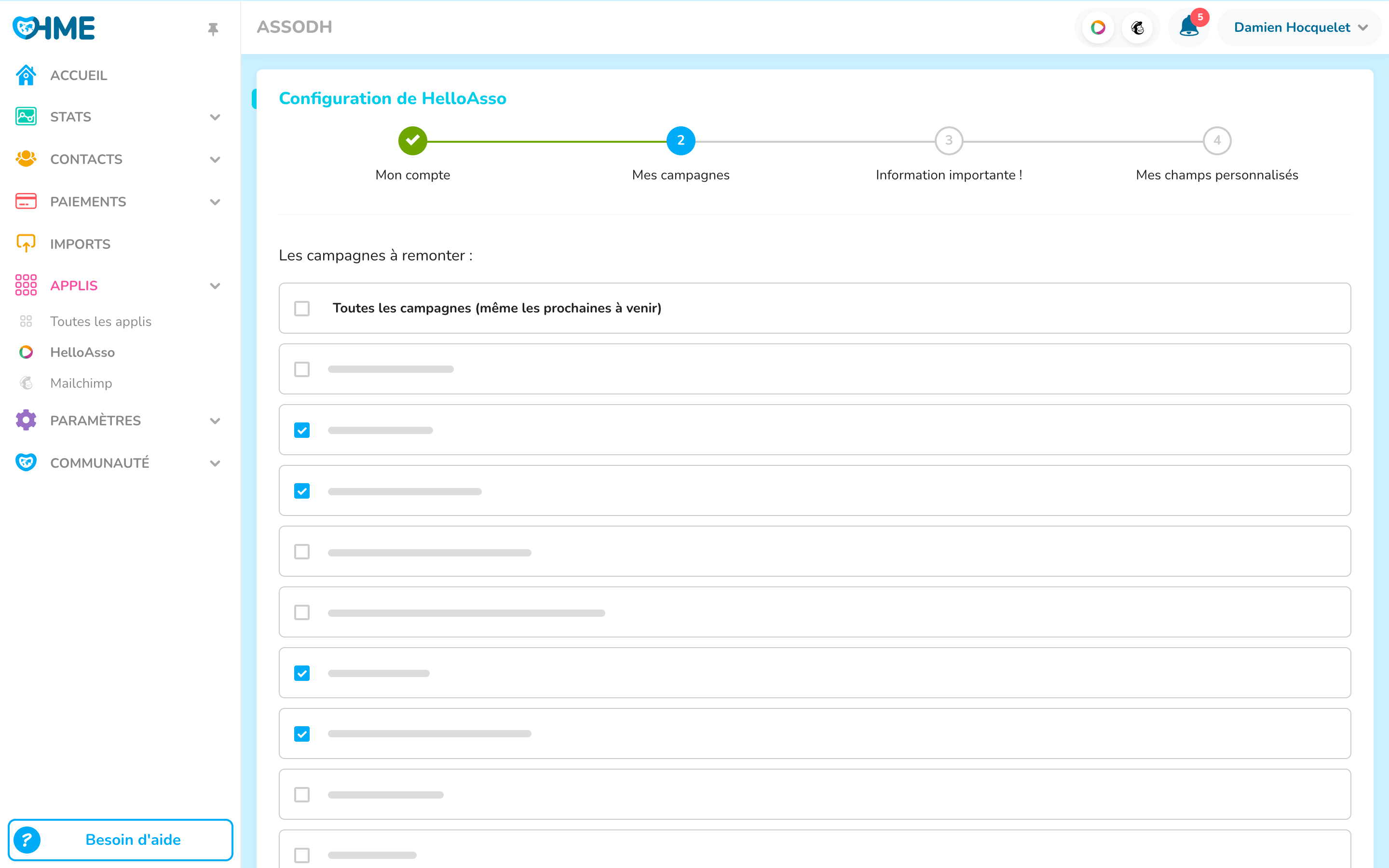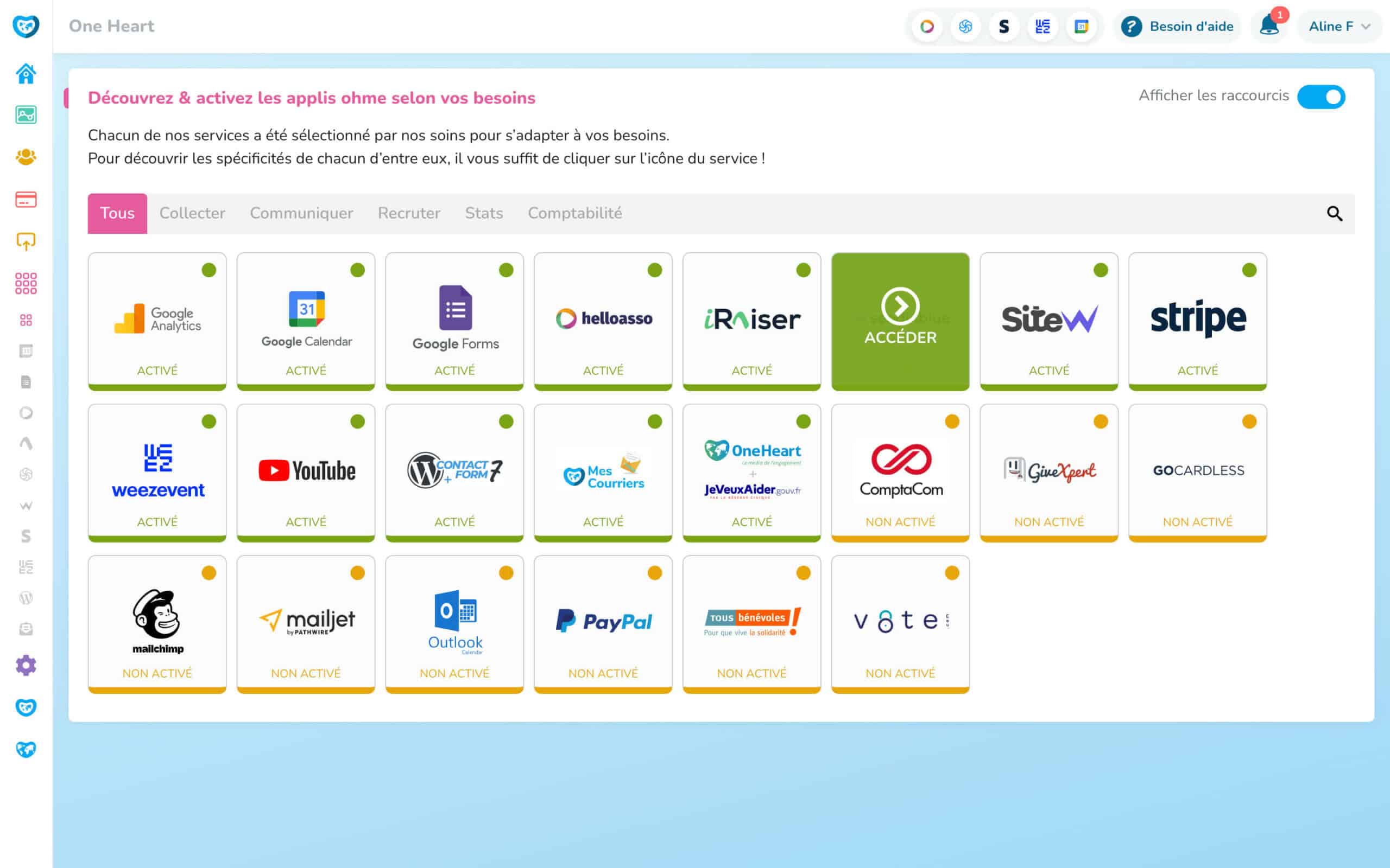• La connexion en quelques clics à plus de 10 applications partenaires (collecte, emailing, recrutement, comptabilité, sites) : il vous suffit de saisir sur OHME vos identifiants ou clés API de vos comptes d’applis partenaires