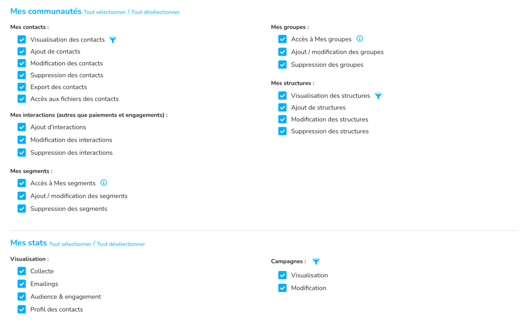 (ex : créer des contacts, supprimer des segments, modifier des dons…).