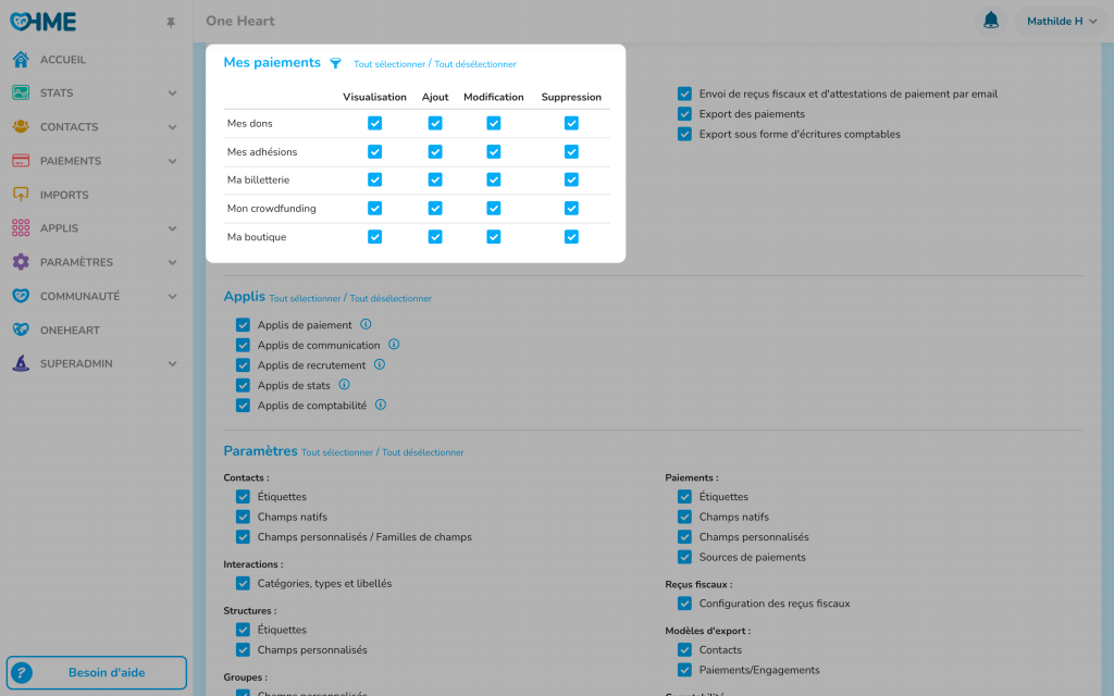 Personnaliser l’espace de travail de chaque équipe : Le pôle « Communication » peut se concentrer sur les données des campagnes marketing, tandis que le pôle « Collecte de fonds » accède aux informations sur les donateurs et les paiements.