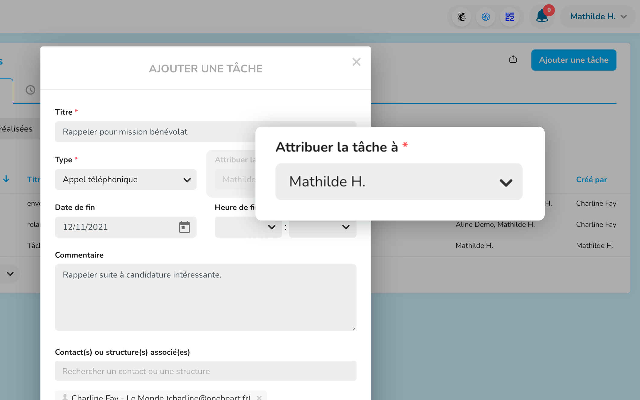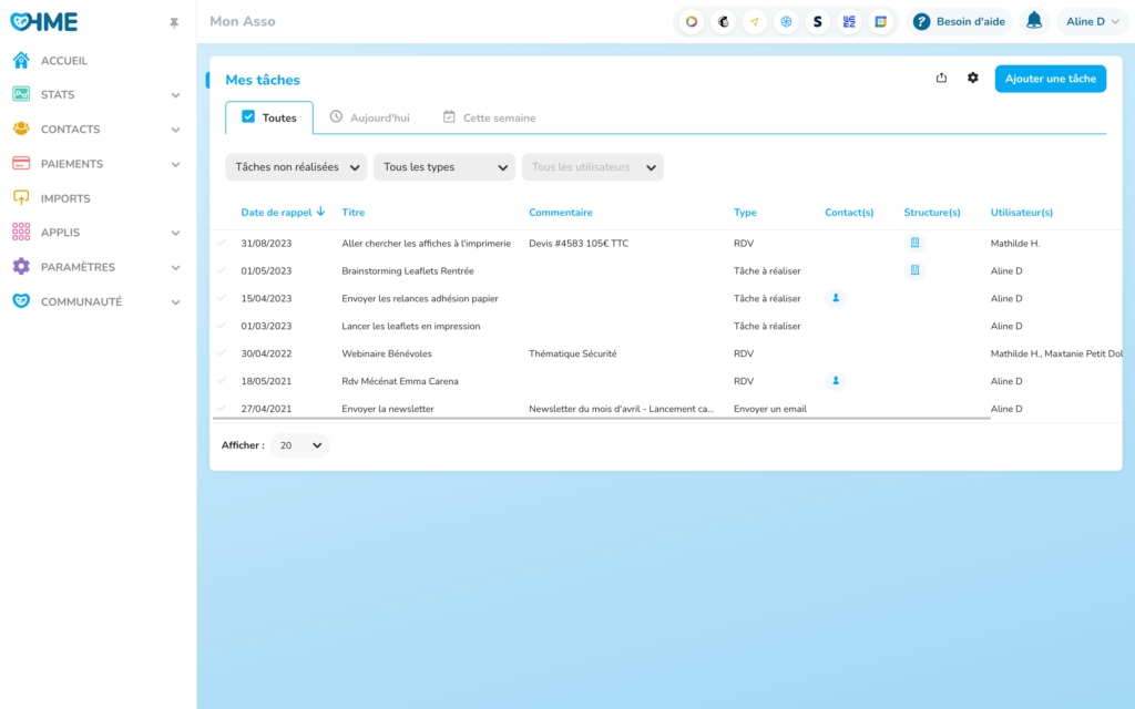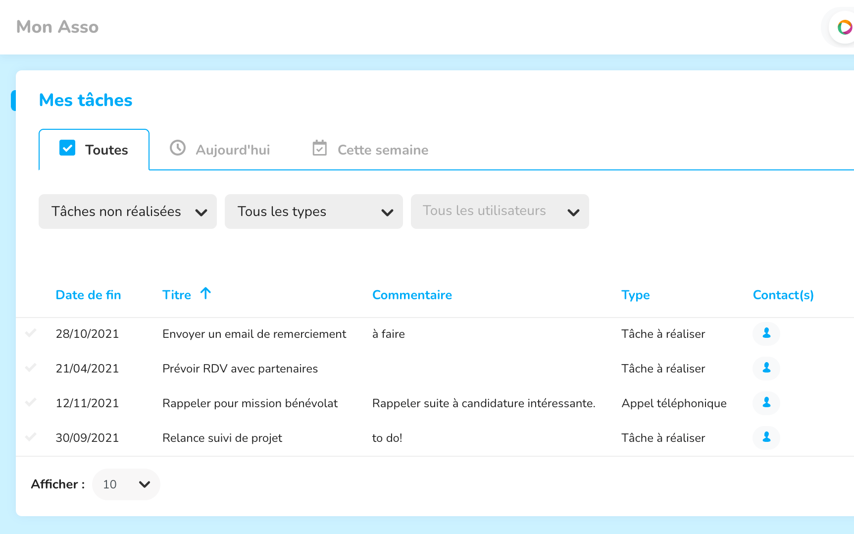 Les tâches & rappels vont vous permettre de vous organiser en équipe et de ne rien oublier : un bénévole à appeler, une réunion avec un potentiel mécène, un emailing à ne pas oublier d’envoyer… Vous pouvez créer des tâches pour vous ou pour les autres, et suivre au quotidien si celles qui ont été réalisées ou celles qui restent à faire.