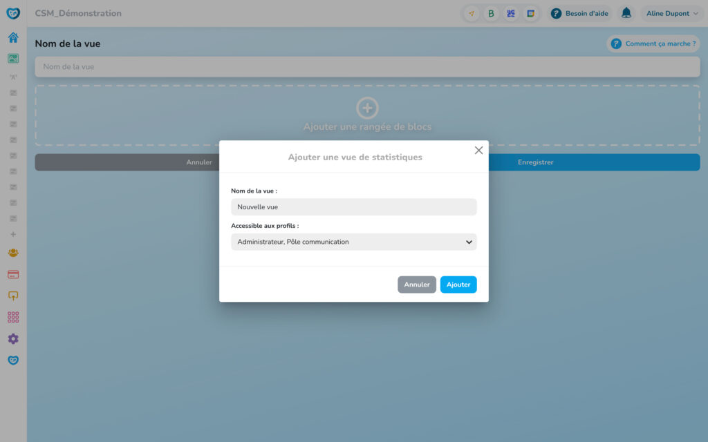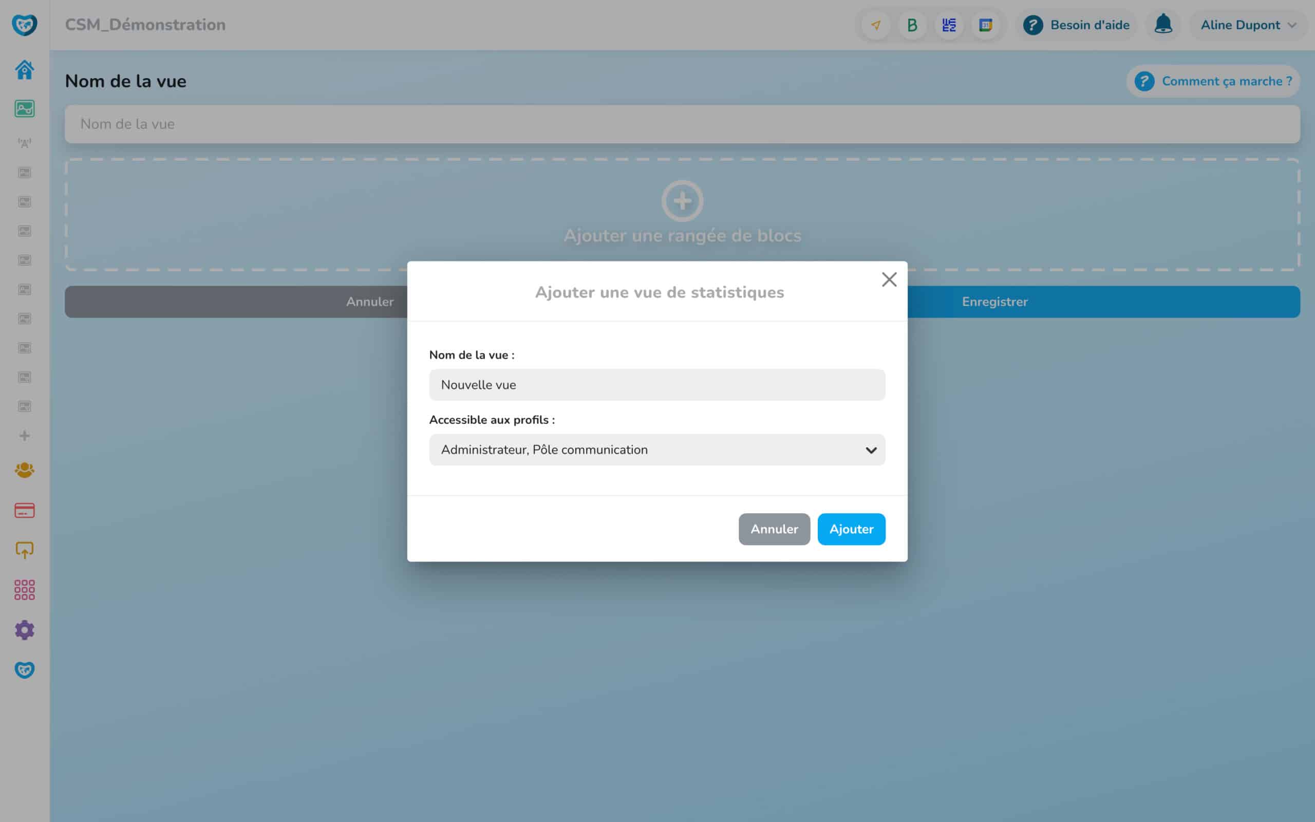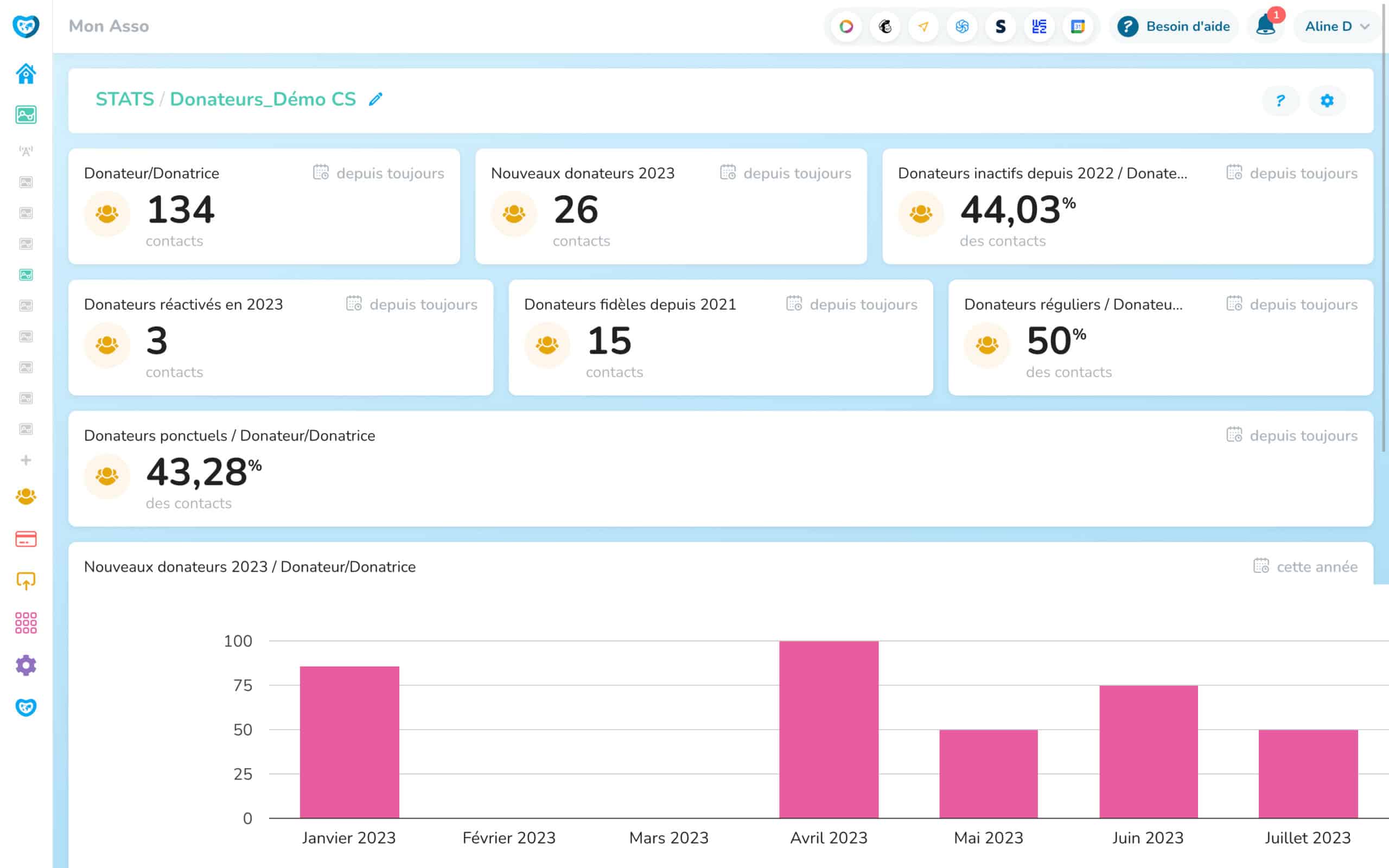 La section Statistiques vous permettra de créer des vues complètement personnalisées pour analyser les indicateurs de votre choix relatifs à vos contacts, leur comportement et leurs paiements. Vous pouvez choisir la forme que prendront ces indicateurs (nombres, pourcentages, courbes…) pour qu’ils soient pertinents dans votre suivi quotidien.