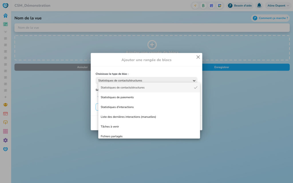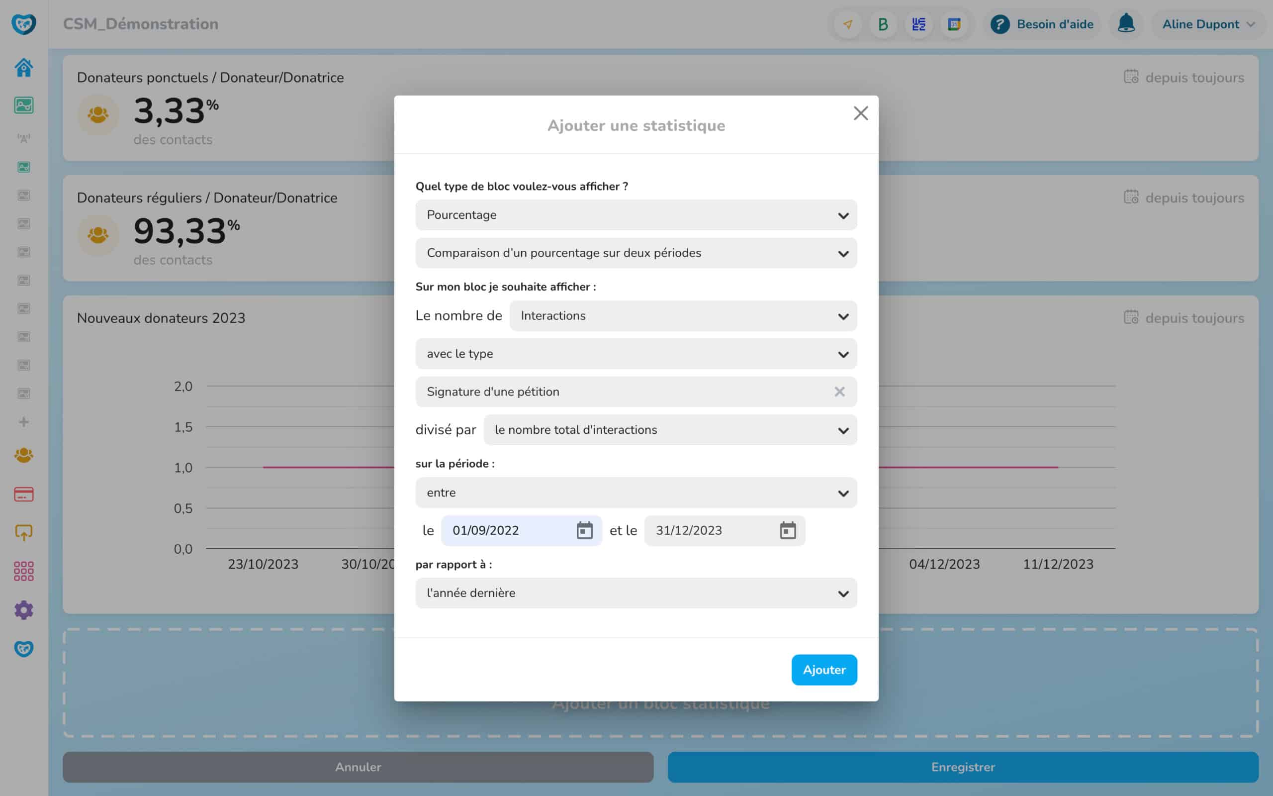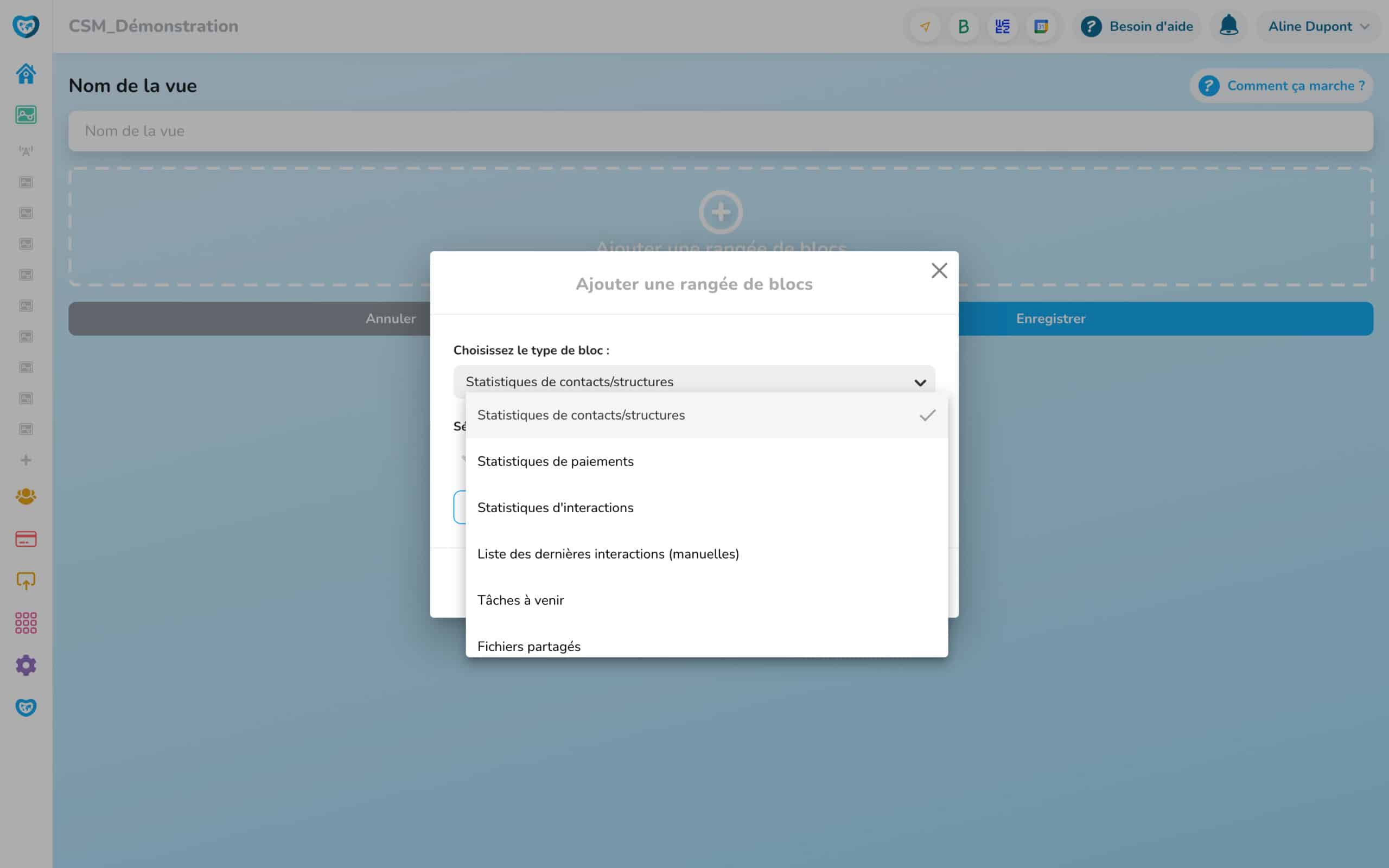 - ce que vous voulez suivre : tels profils de contacts, tels profils de structures, tels types de paiements ou tels types d’interactions