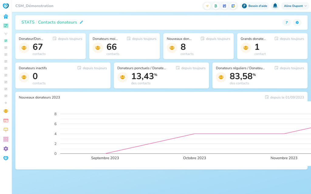 Une configuration de blocs statistiques concernant vos contacts, vos structures, vos interactions, vos paiements et engagements