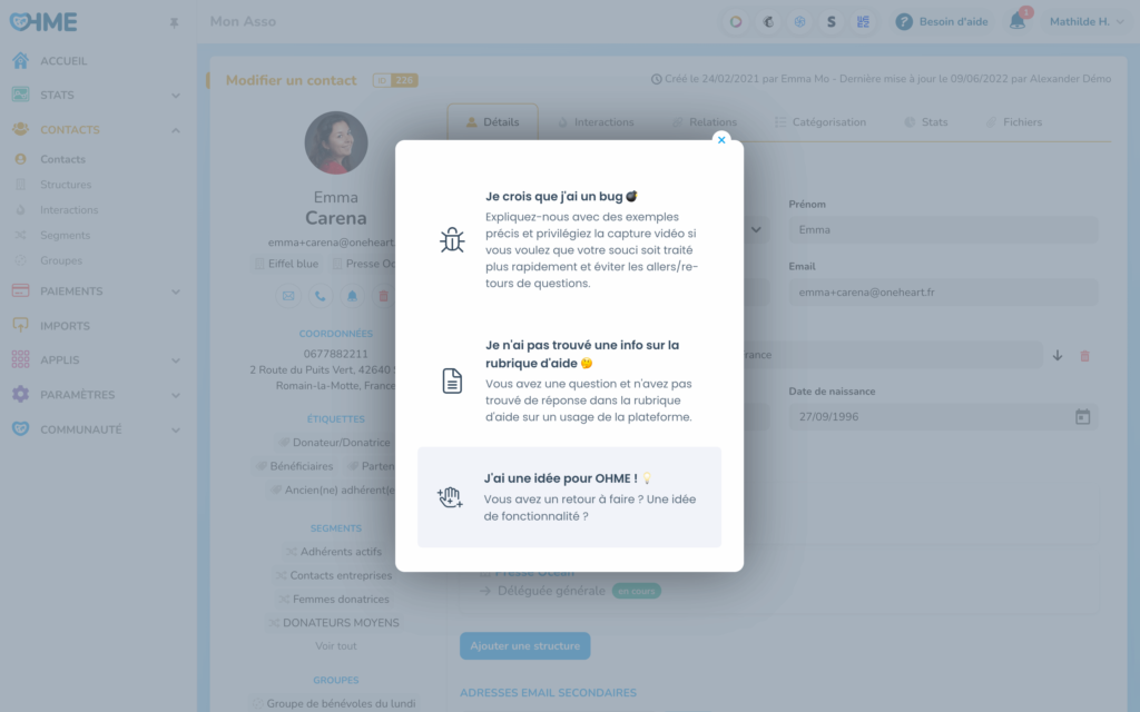 Parfois, certains besoins exprimés sont refusés car soit infaisables (ex : connexion à une application qui ne le permet pas), soit trop spécifique à une seule association (ex : ajouter tel champ natif pour tout le monde) ou alors en dehors de notre périmètre de plateforme. En tout cas, toutes nos évolutions sont faites en fonction de la communauté OHME, donc n’hésitez pas à partager avec nous vos besoins