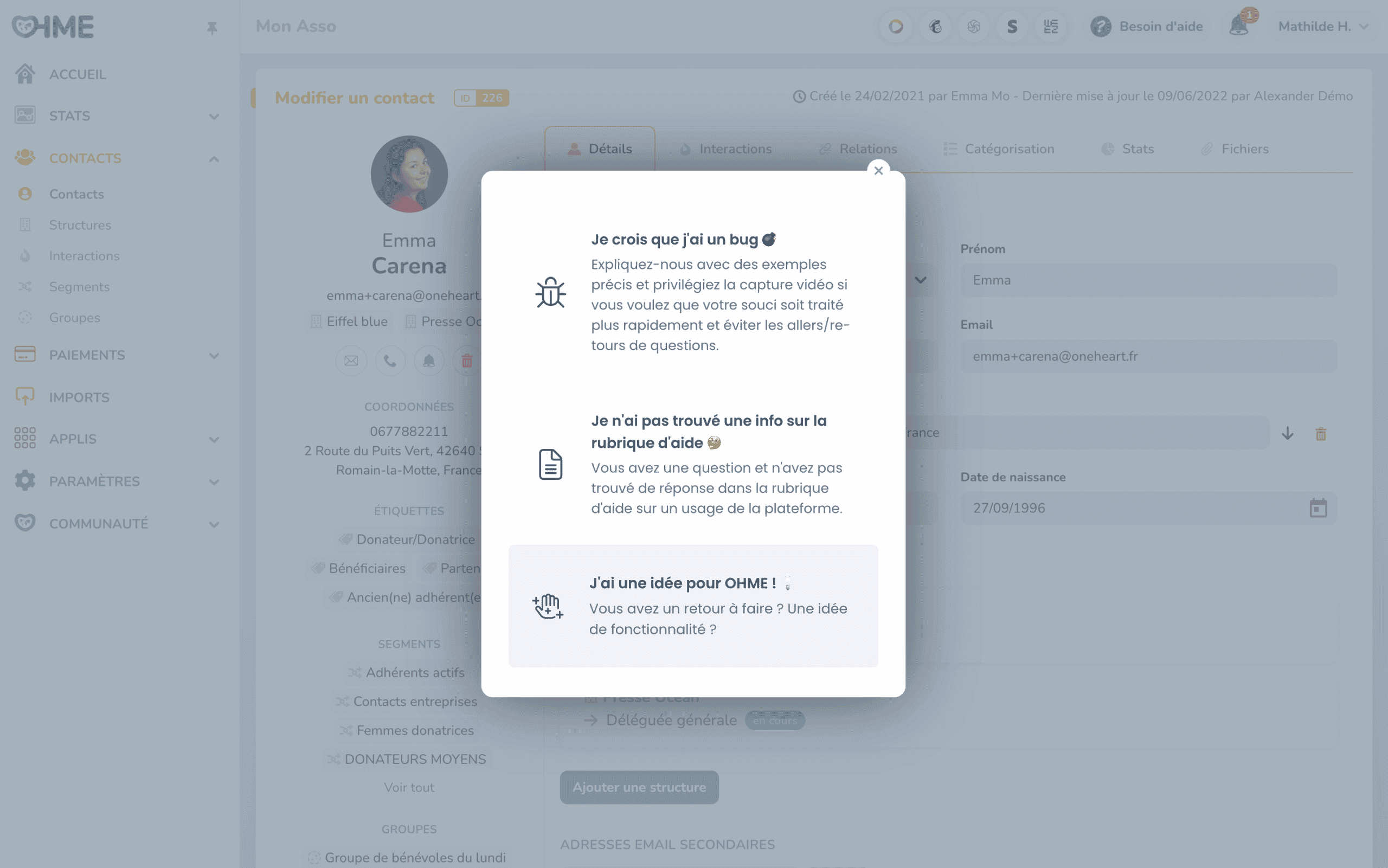 Nous avons un canal dédié à cela : vous pouvez cliquer sur Besoin d’aide, puis sur contacter le support et enfin sur 💡 J’ai une idée pour OHME.