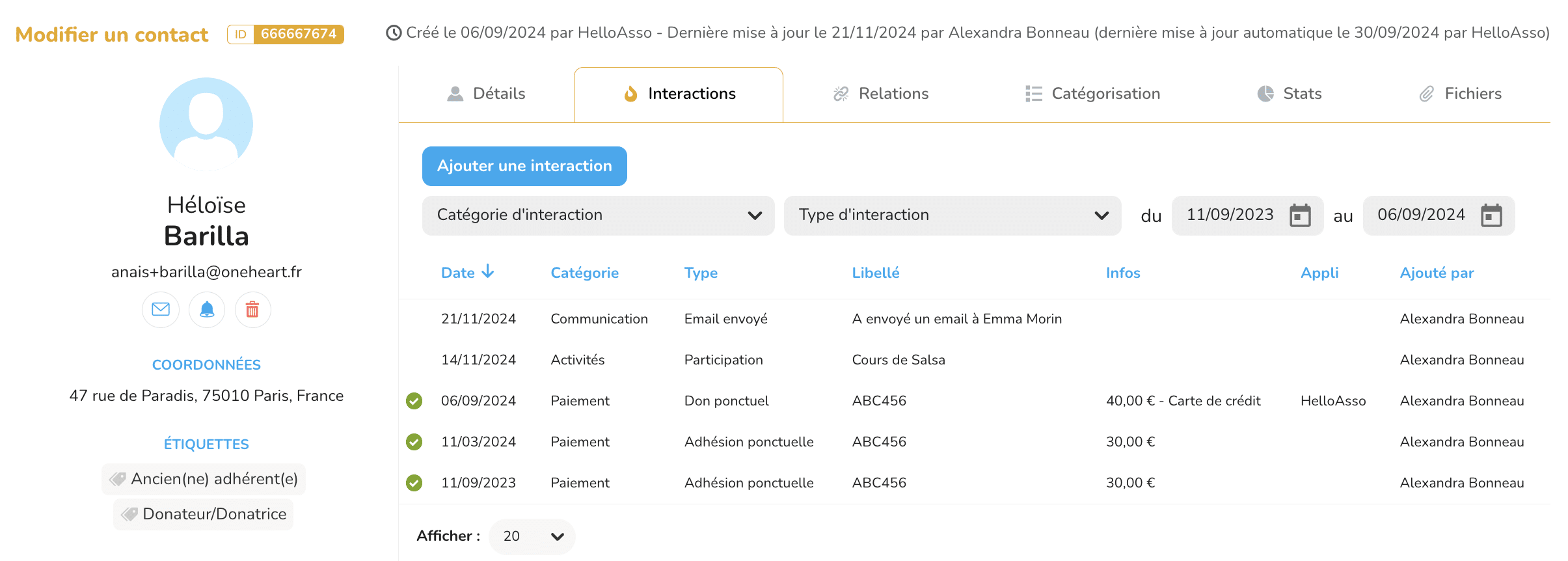 Par exemple, si une personne qui n’est pas dans votre base OHME prend son adhésion via HelloAsso, une fiche contact est créée dans OHME et les informations du paiement de l’adhésion sont remontées sur sa fiche. Si le contact existait déjà, ses informations sont mises à jour automatiquement. L’objectif étant de vous permettre de gagner du temps ! - Pour tout savoir sur la connexion de notre CRM OHME et HelloAsso, c’est par ici