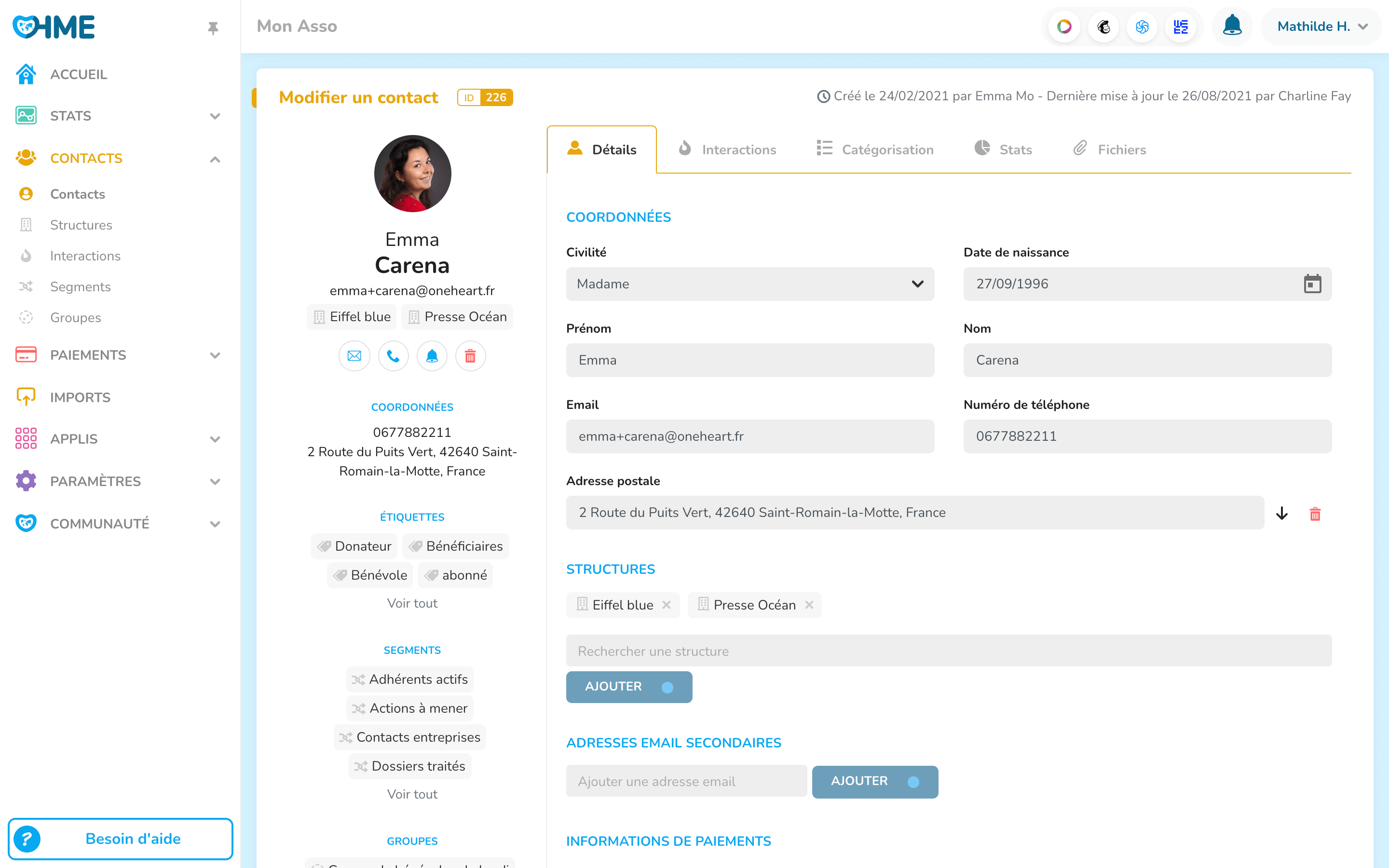 Chaque adhérent possède une fiche sur laquelle toutes ses informations sont enregistrées : coordonnées, informations particulières, dates et montants d’adhésions. Et tous les moments d’échange (appels, emails, réunions) peuvent être répertoriés directement sur leur fiche, pour garder un historique !