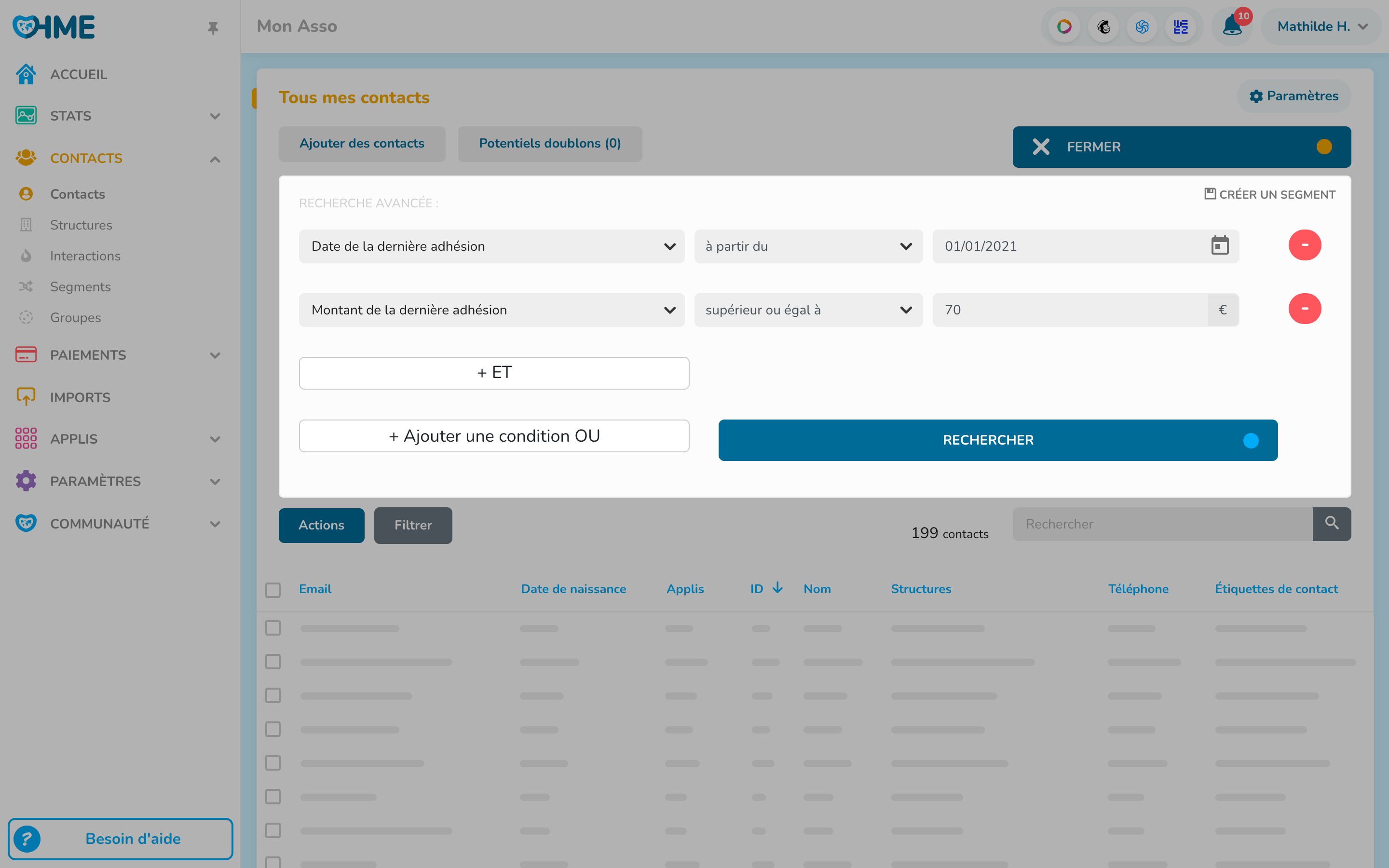 Recherchez en quelques clics vos adhérents à jour et à relancer. Enregistrez vos recherches et synchronisez-les en quelques clics à votre solution emailing pour leur envoyer le bon emailing au bon moment, ou alors cliquez sur “Envoyer un email” depuis OHME pour leur envoyer un email collectif depuis votre Messagerie.