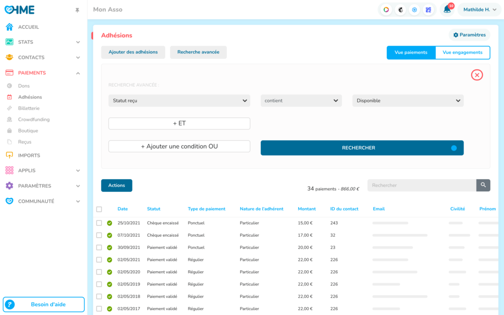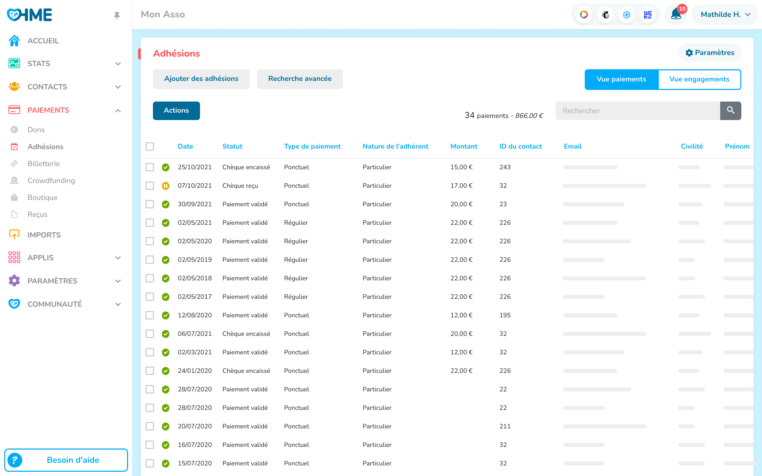 Avec le CRM OHME, gérez vos adhésions de A à Z : enregistrez vos paiements, classifiez vos adhérents et relancez les retardataires. Et avec nos partenaires de collecte connectés à notre logiciel, remontez tous vos paiements en ligne (HelloAsso, iRaiser, Stripe, GiveXpert..) : vous allez gagner du temps !