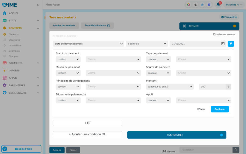 Quels donateurs n’ont pas donné depuis un an ? Qui a donné pour telle cause ? Qui donne beaucoup et qui a un plus petit budget ? Grâce à la recherche avancée, retrouvez en quelques clics vos donateurs selon vos critères. Et hop, envoyez-leur ensuite la communication adaptée pour les remercier ou les solliciter sur un nouveau projet !