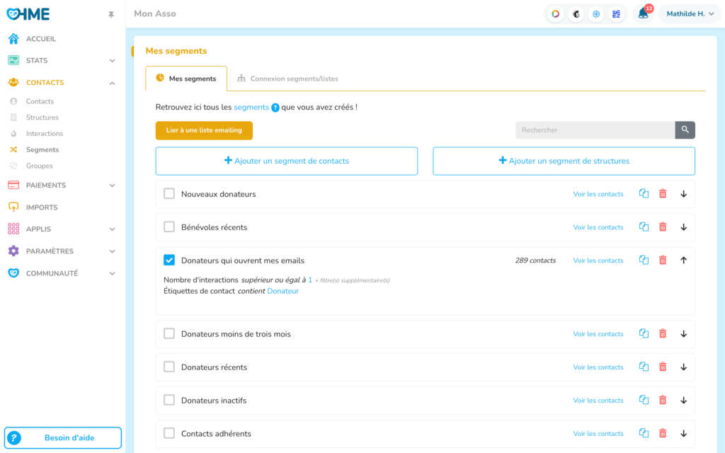 Après avoir recherché et segmenté vos donateurs selon tel ou tel critère, vous pouvez envoyer vos segments dans les listes d’envoi de votre solution d’emailing. Par exemple, si vous créez un segment “Adhérents de l’année” en fonction de la date de la dernière adhésion, vous pouvez en créer une liste sur votre solution emailing pour leur envoyer des communications tout au long de l’année. Et si une nouvelle adhésion arrive ? Alors la personne adhérente est ajoutée au segment automatiquement et envoyée sur la liste emailing automatiquement. Magique, non ?