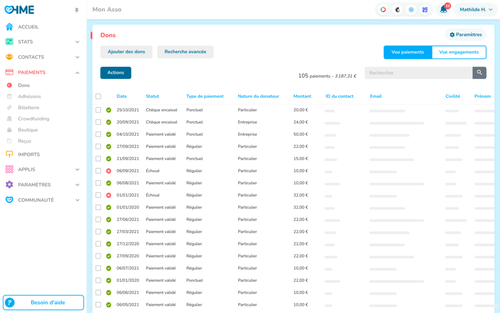 Tous vos donateurs sont rangés dans votre tableau de contacts avec champs natifs et personnalisés (illimités et de tout type). Et tous vos dons sont également affichés dans un tableau, avec toutes les informations nécessaires : date, statut, montant, don régulier lié à une engagement ou don ponctuel, statut du reçu fiscal, etc.