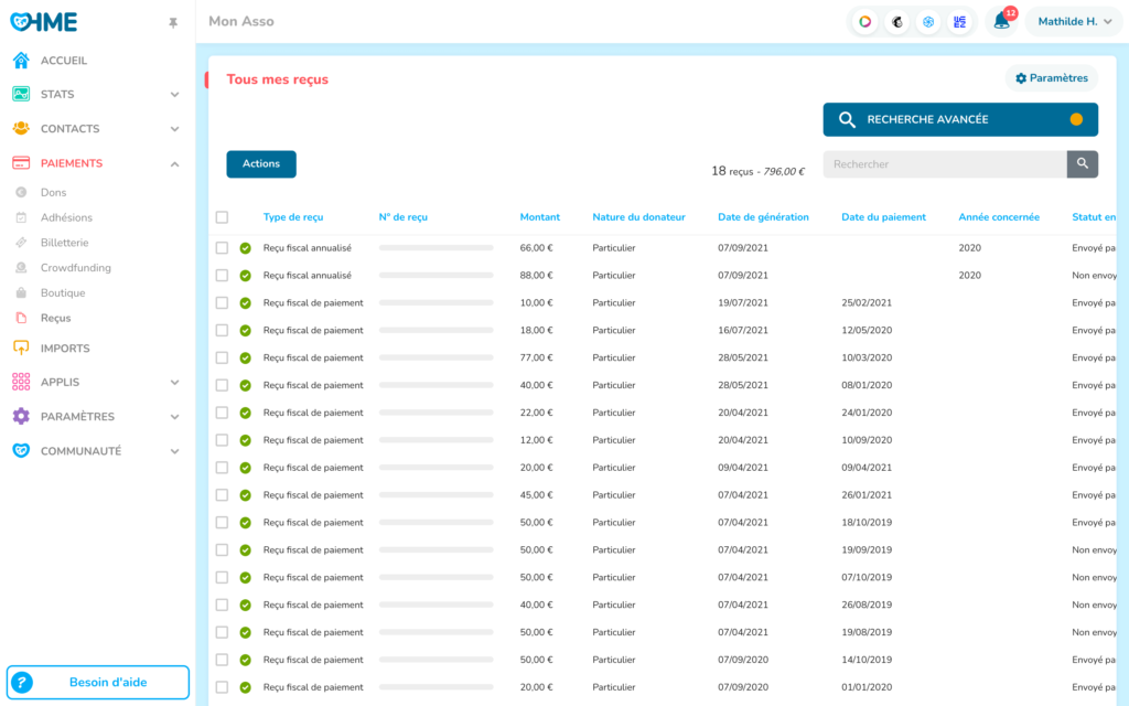 Avec le logiciel CRM OHME, tous vos dons seront centralisés et vos reçus fiscaux générés facilement. Suivez ainsi l’activité et l’engagement de vos donateurs grâce à nos tableaux de suivi, notre segmentation avancée et nos statistiques, pour ensuite mieux les fidéliser !